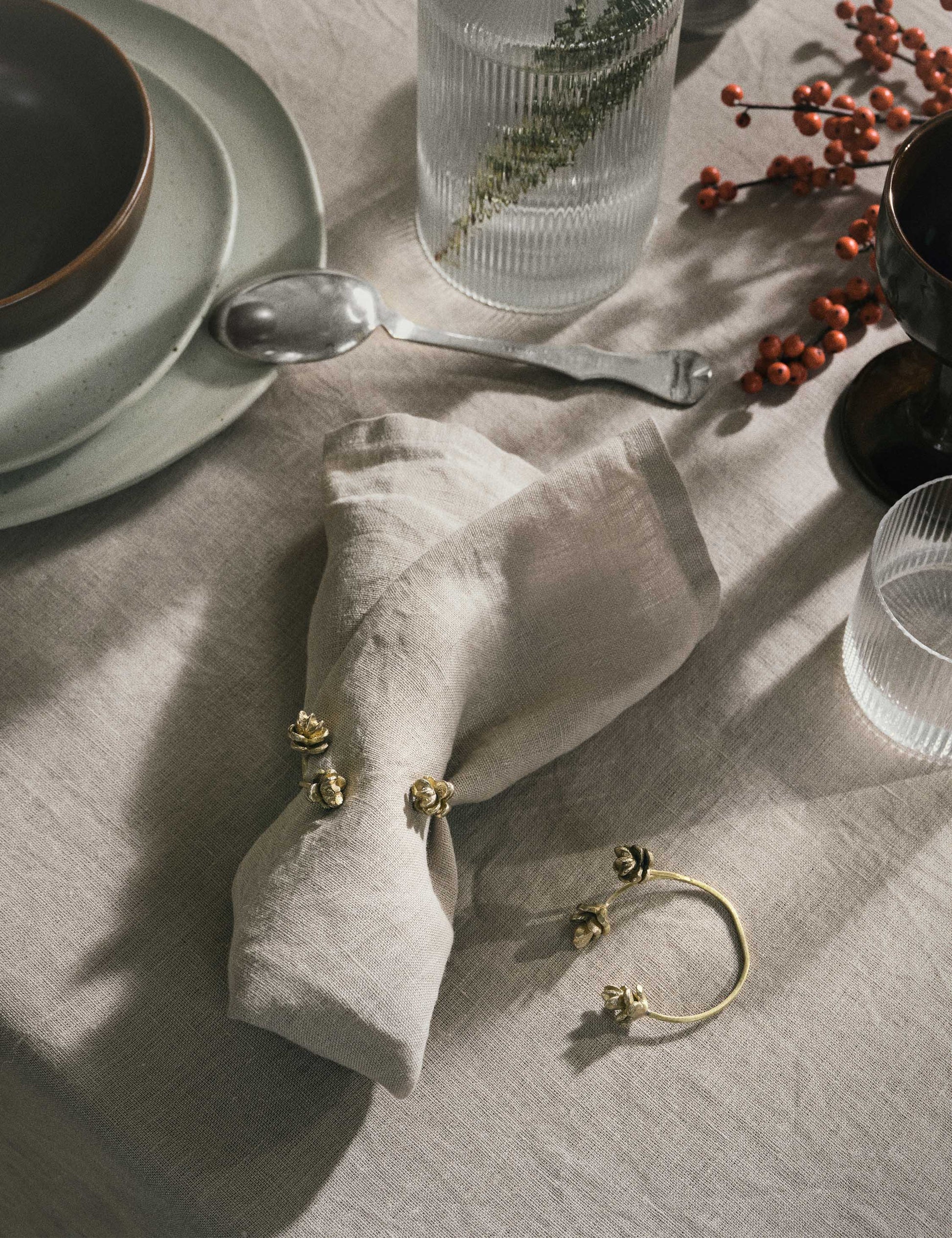 Ces ronds de serviette en laiton présentent une forme sculpturale qui leur confère une touche organique et naturelle. Un accessoire polyvalent, idéal toute l'année ou comme décoration raffinée pour les fêtes.