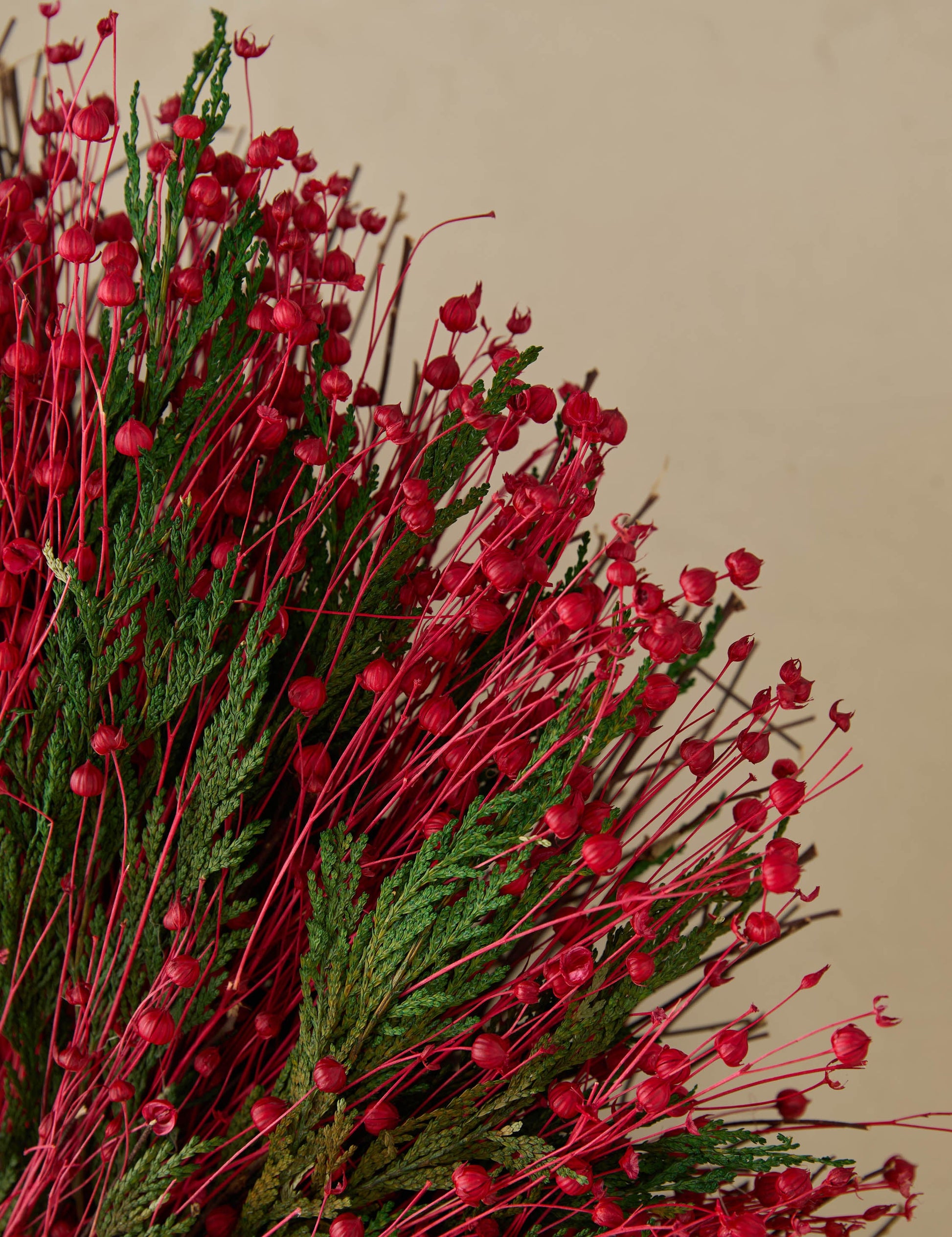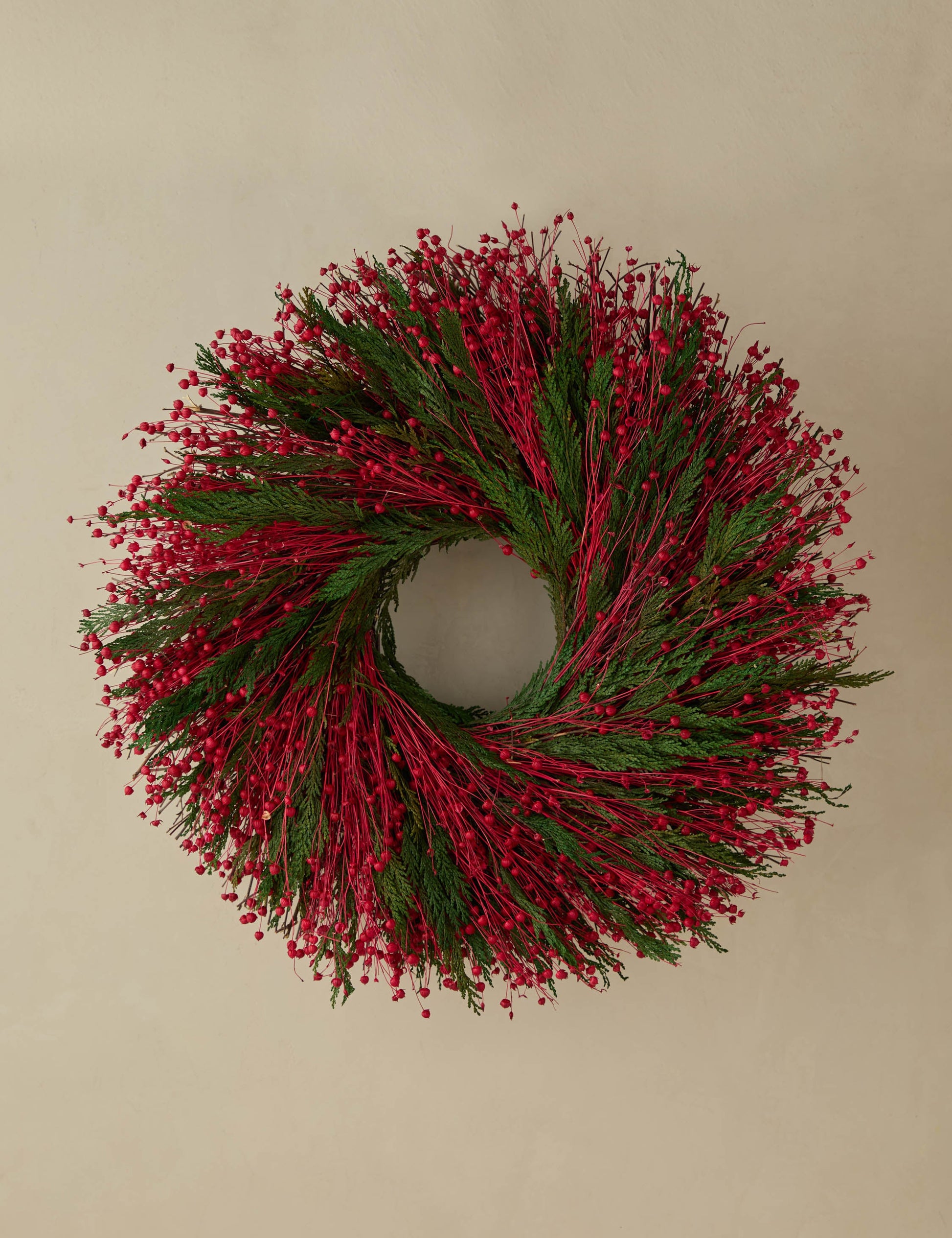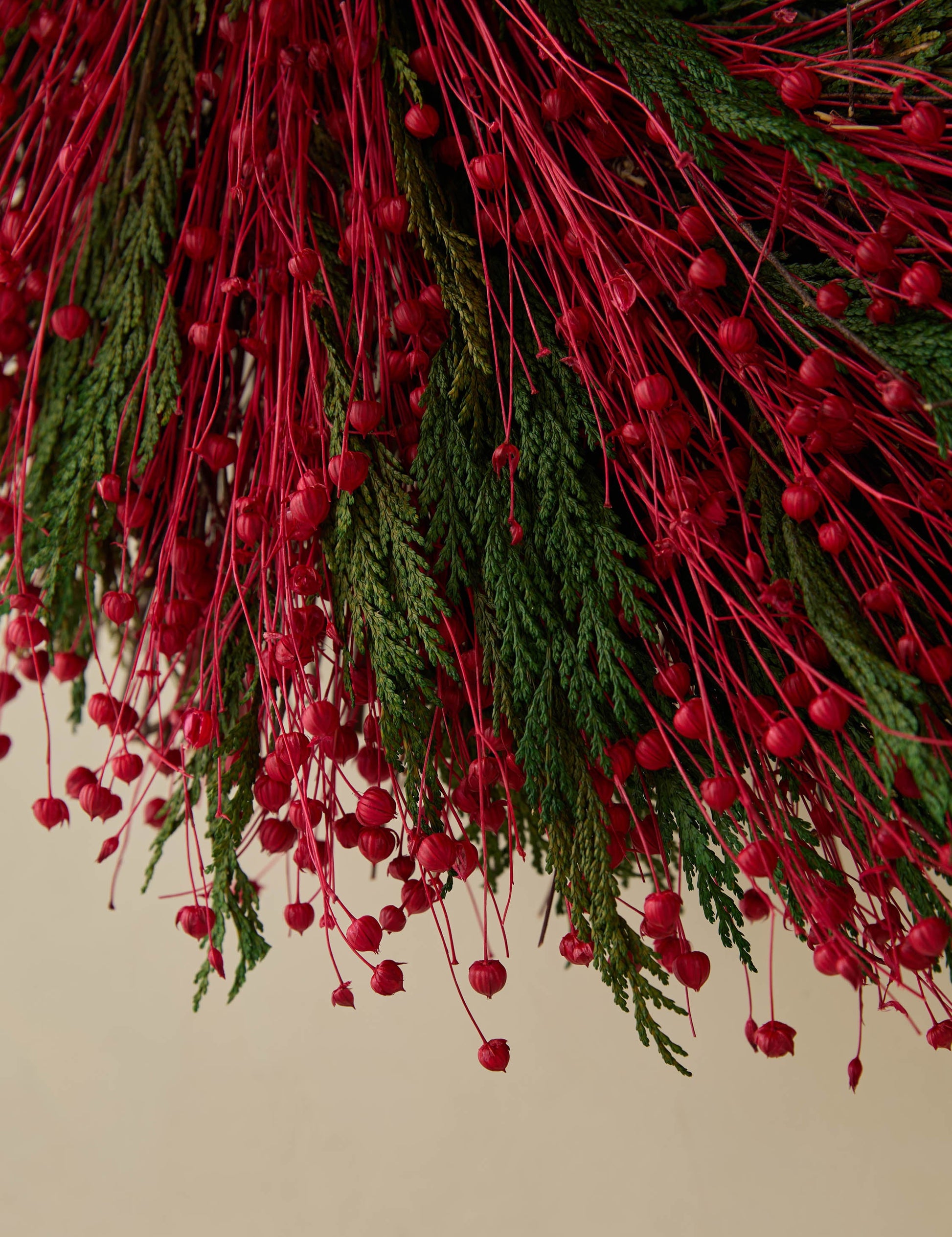 Lumineuse, festive et pleine de texture, cette couronne de Noël est composée de brindilles de cèdre stabilisées et de lin rouge. Accrochez-la à votre porte ou au-dessus de votre cheminée pour un look intemporel et audacieux.