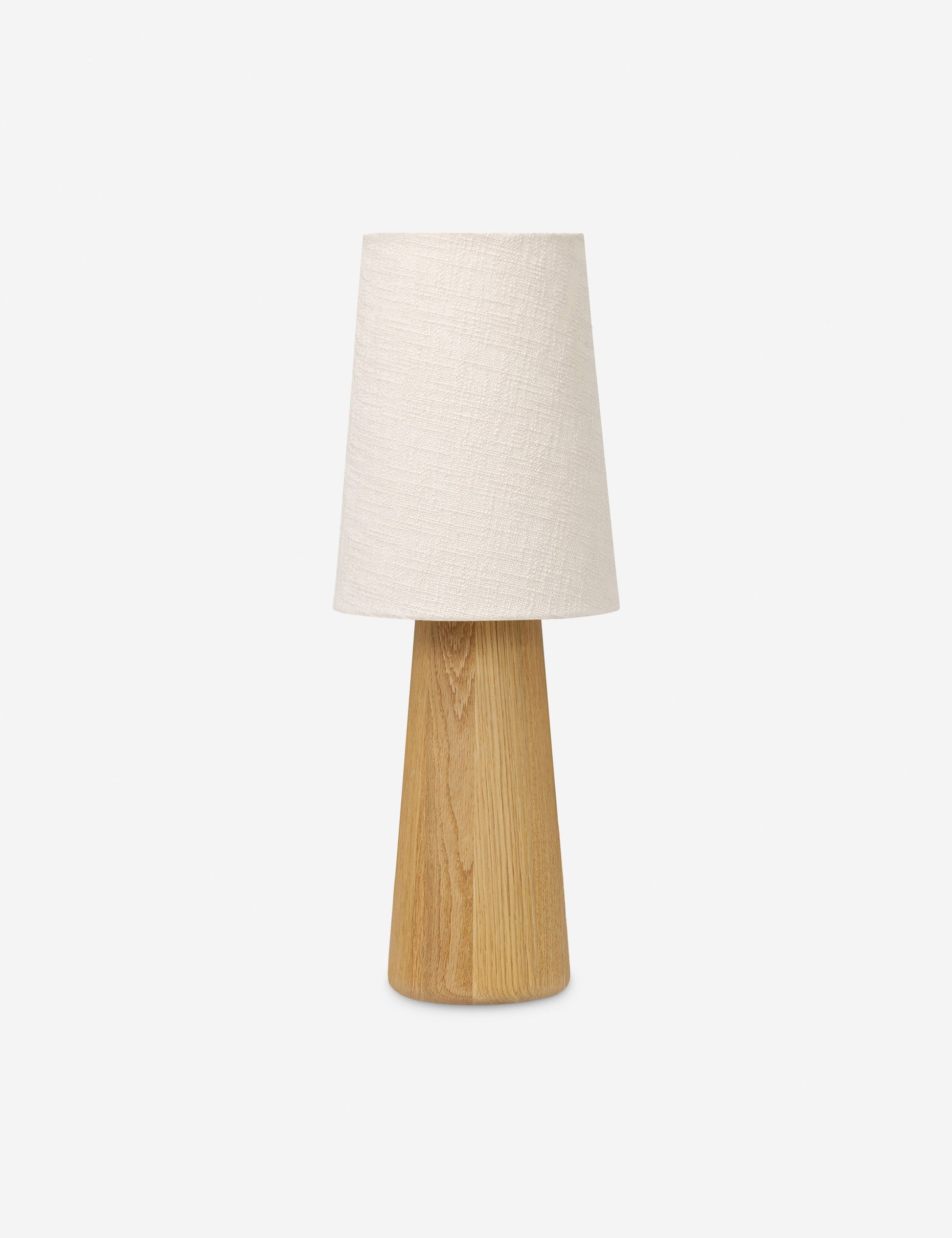 Le minimalisme moderne rencontre le traditionnel. Conçue pour une table, sa base conique en bois et son abat-jour en lin bouclé confèrent à cette lampe une touche chaleureuse et apaisante. Une lampe de table polyvalente et design, idéale pour un buffet, une commode ou une console.