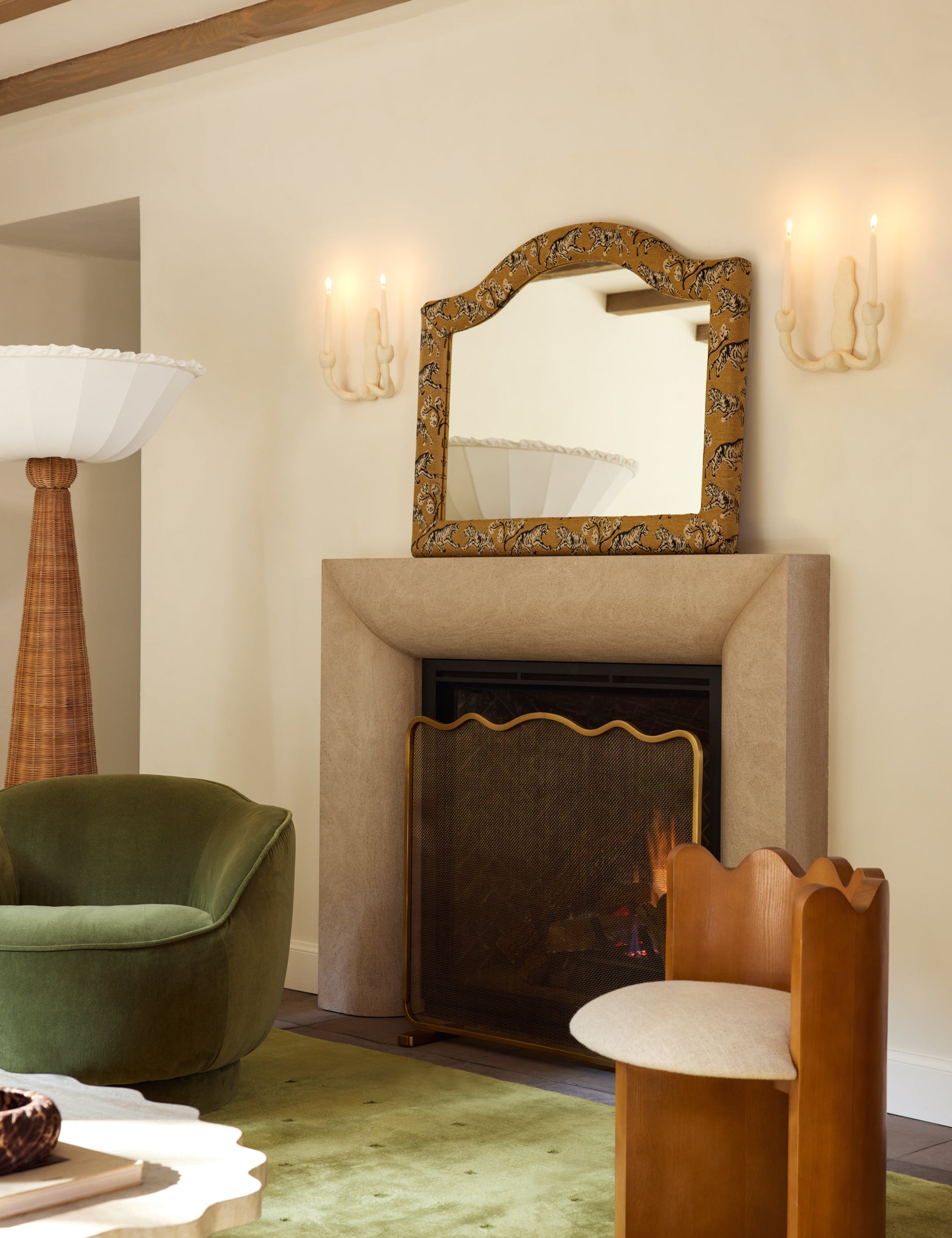 Avec sa forme légèrement arquée, ce miroir apporte une silhouette classique et une touche raffinée. Son cadre est orné du motif Tigre signature de Sarah, dessiné par son fils et rehaussé d'un motif complexe qui apporte un charme vintage à tout espace. Ce miroir de cheminée est issu de notre collaboration exclusive avec Sarah Sherman Samuel et reprend toutes les caractéristiques de son style chaleureux et raffiné.