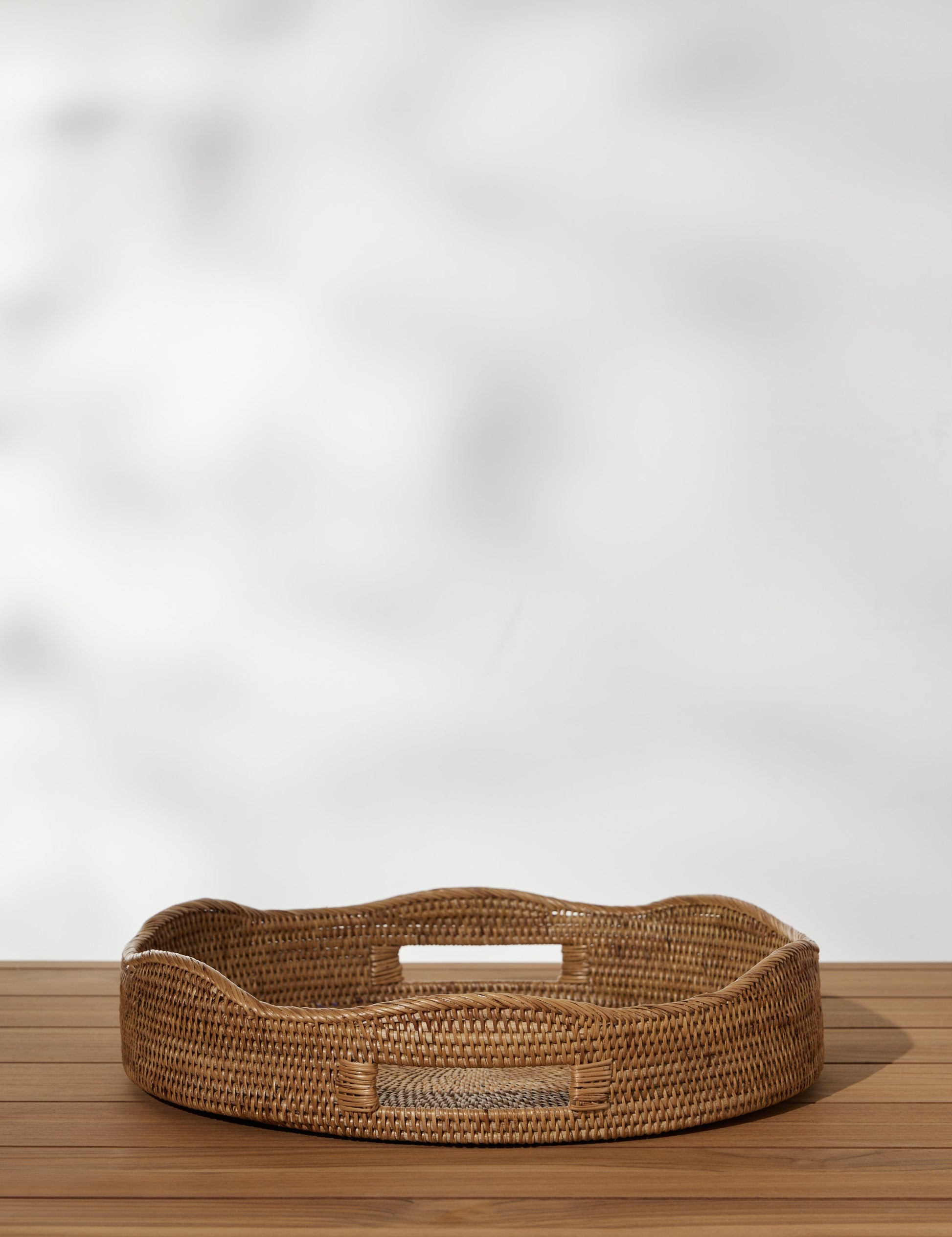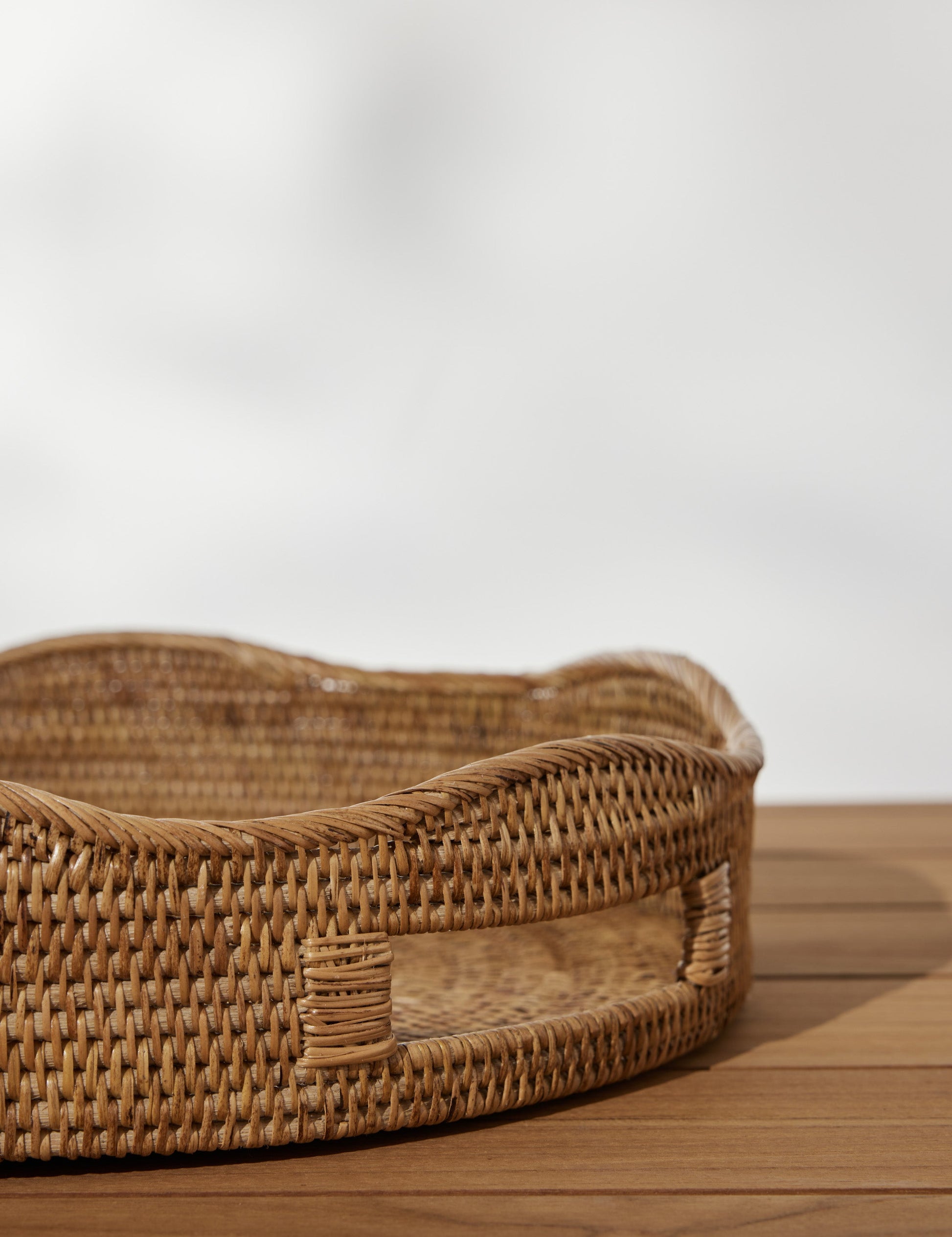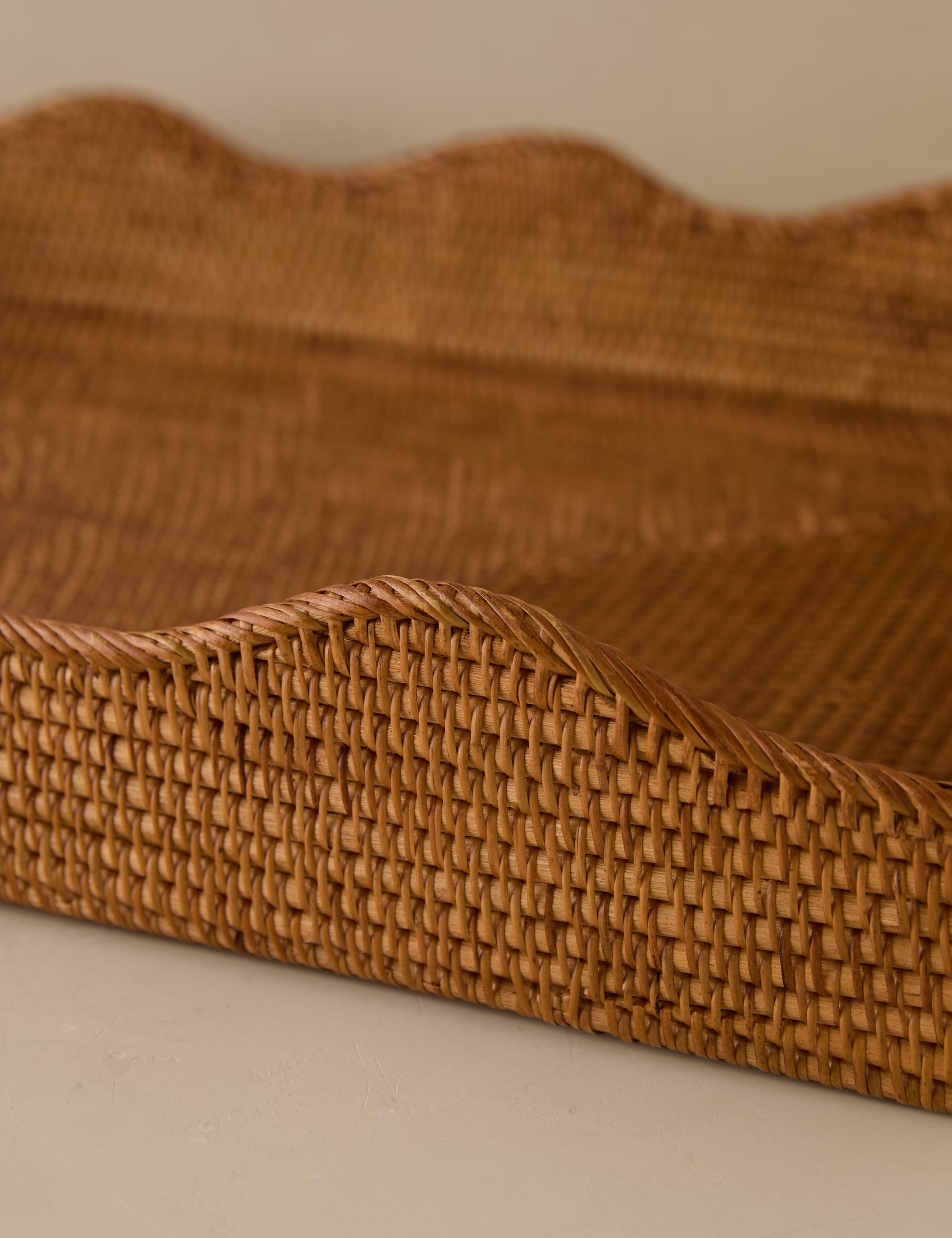 Donnez un nouveau look à vos préparations culinaires grâce au bord festonné et aux poignées classiques de ce plateau en rotin. Idéal sur une table basse ou un comptoir de cuisine, il permet de mettre en valeur vos accessoires, vos décorations ou de présenter des fruits à peler. Sa finition naturelle confère une texture organique à toutes les surfaces.