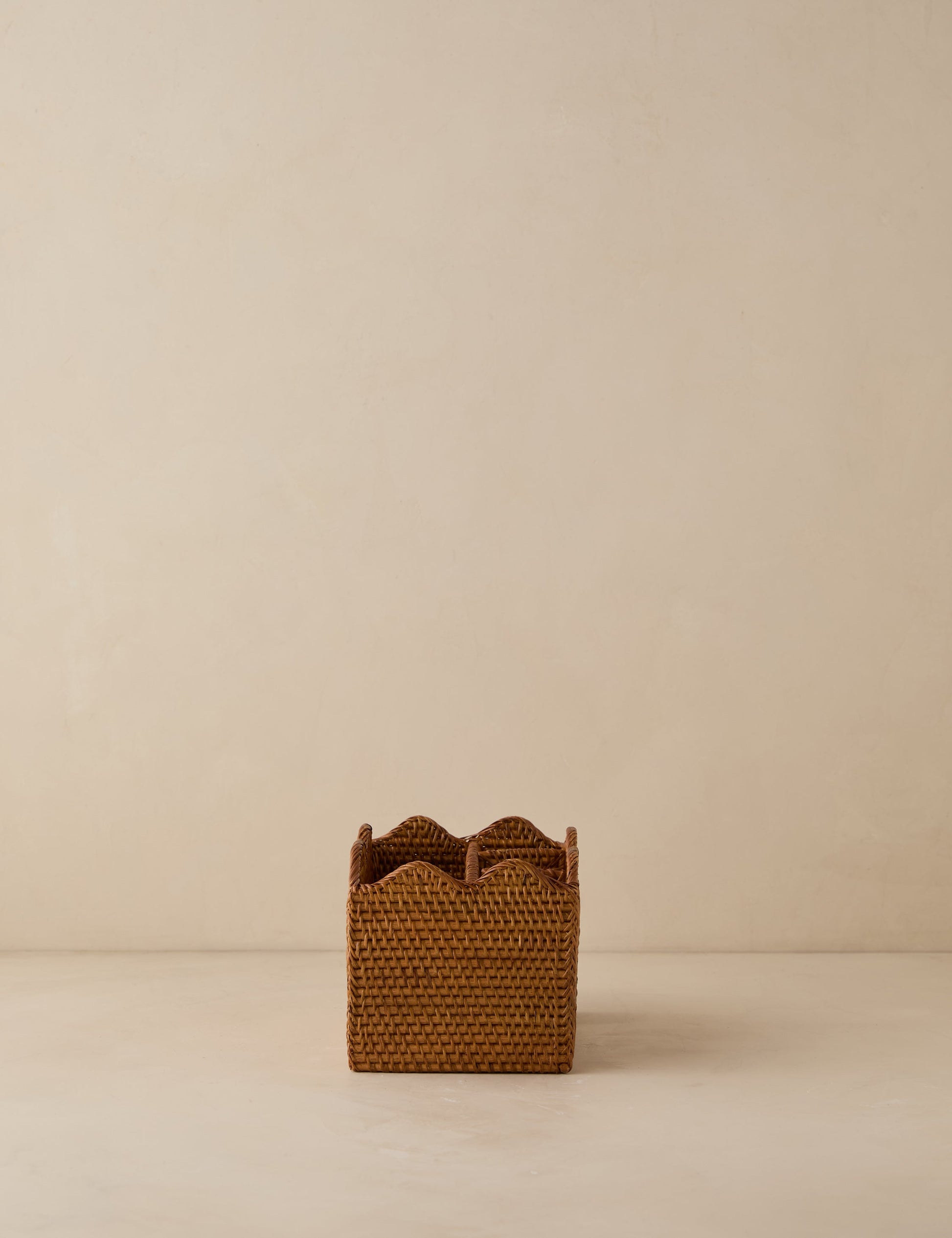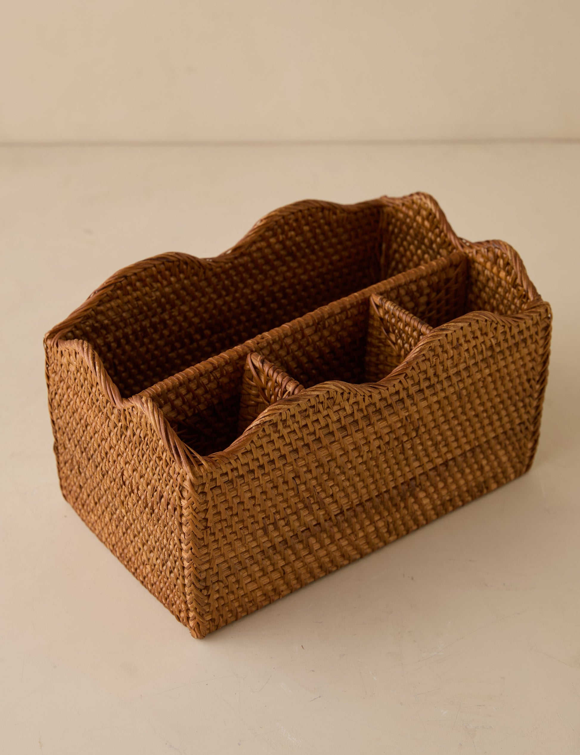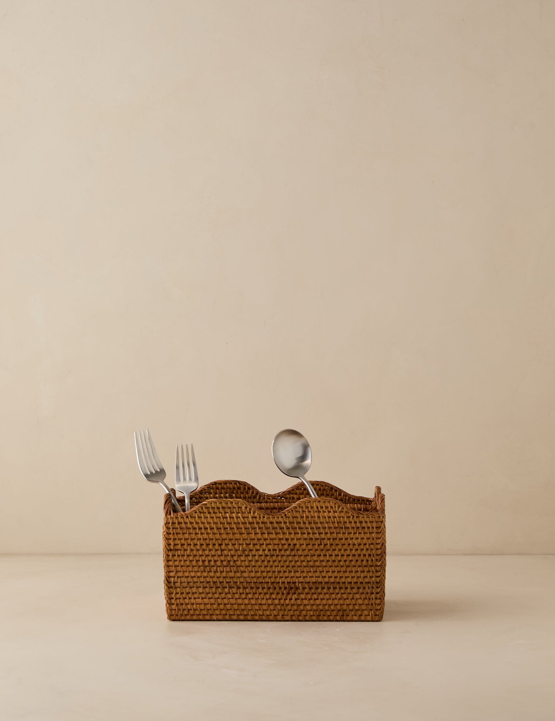 Donnez un nouveau look à votre cuisine ou salle à manger grâce au bord festonné et à la texture tressée de ce porte-ustensiles en rotin. Idéal pour les couverts, les serviettes ou les sauces, il garde l'essentiel à portée de main tout en ajoutant une touche de chaleur naturelle à votre table ou plan de travail.