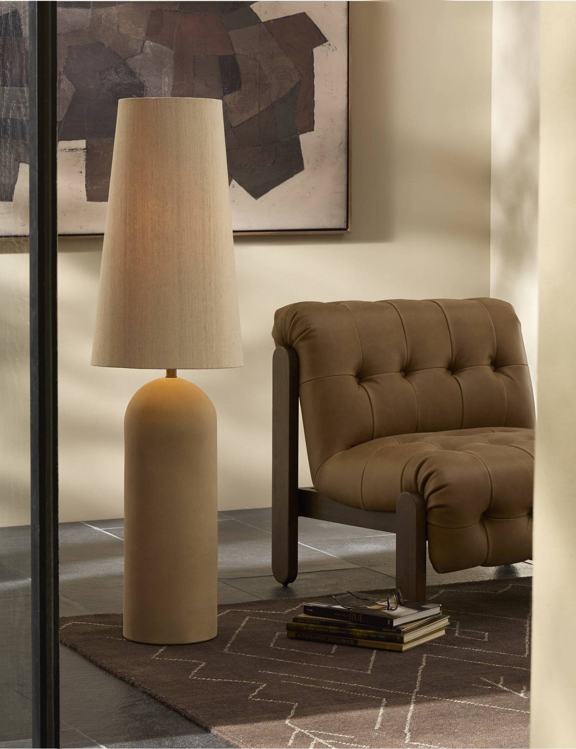 La lampe Umberto allie douceur et audace. Un haut pied en céramique soutient l'abat-jour festonné, créant un contraste avec ses lignes fluides. Installez ce lampadaire dans un coin ou à côté d'un canapé pour une touche d'ancrage et un effet sculptural.