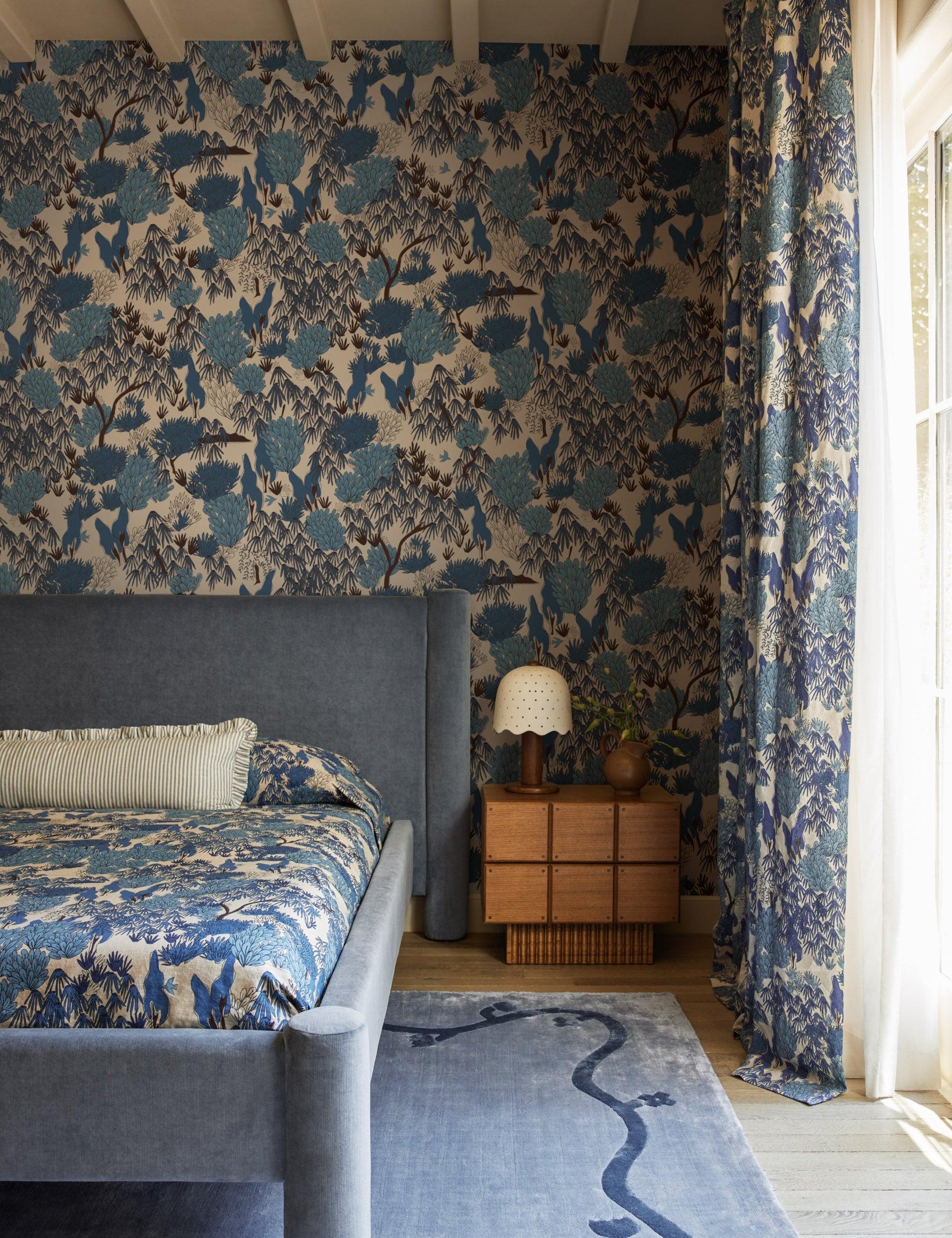 Le tapis Vinyet encadre un fond bleu doux avec une bordure sinueuse rappelant une vigne pour un look à la fois ludique et raffiné. Ses lignes fluides confèrent une élégance naturelle et un ton posé, réfléchi et raffiné. Ce tapis en viscose est issu de notre collaboration exclusive avec Sarah Sherman Samuel et reprend toutes les caractéristiques de son style chaleureux et raffiné.